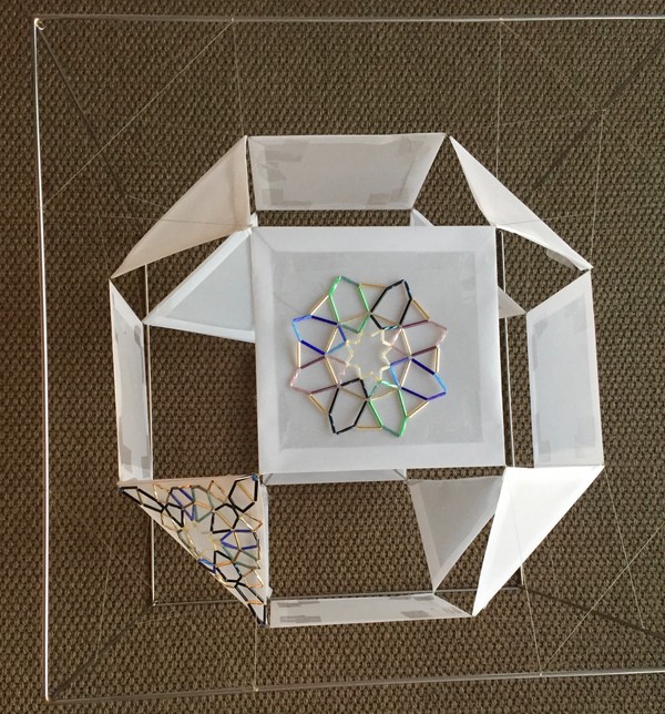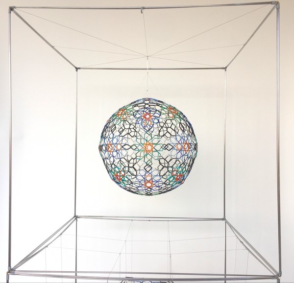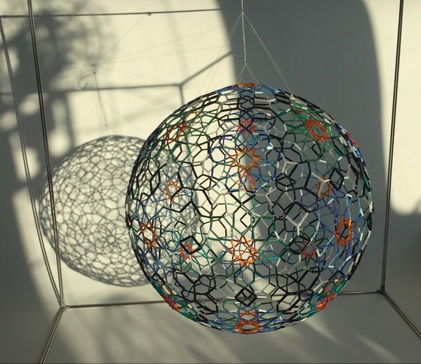 Durante varios años mi trabajo se ha centrado en el desarrollo de sólidos platónicos y arquimedianos. En este camino he llegado a un punto de más complejidad al aplicarles en sus caras los motivos de patrones geométricos del arte nazarí de la Alhambra de Granada, que a la vez me ha llevado a esferizar estas formas. La construcción de estos poliedros las realizo totalmente a mano y con tubos de vidrio como material principal. A través de esta experiencia he ido descubriendo métodos empíricos para el cálculo, medidas y proporciones y soluciones innovadoras para llevarlas a cabo. Cuando creo que están acabados, me doy cuenta de las muchas dimensiones que poseen, entonces los siento vivos y en continua transformación.