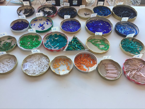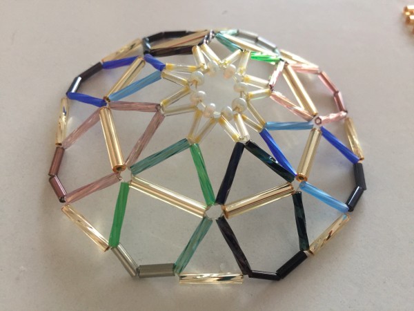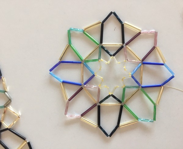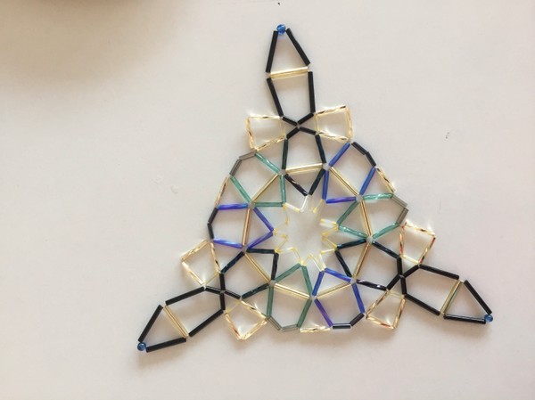 Siguiente paso, construir todos los polígonos: - Hice los 8 triángulos del rombicuboctaedro, 4 donde predominan los azules y 4 predominando los verdes. - Hice los 6 cuadrados “visibles” del rombicuboctaedro también en las dos gamas de colores, azules y verdes. Para esto tuve que preparar la cantidad de elementos (1702 tubitos), seleccionarlos y cortarlos a su medida, en sus céntidades y colores (naranja-melado en los centros, azules o verdes para las estrellas, ayudadas por algunos toques de blanco y en los laterales, negro. Los tubitos de vidrio se pueden cortar con una maquinita Dremel con disco de sierra de dentista... uno por uno.