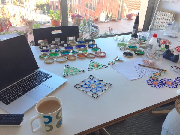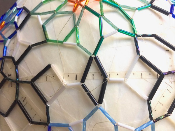 Cómo se transforman los cuadrados y triángulos en las formas curvas para la esfera? Trabajé con una bola de poriespán, la dividí en espacios que en sus vértices correspondían a los de los triángulos y cuadrados del rombicuboctaedro. Lo explica muy claro Keith Crishlow en “Oder in space”. Pero necesitaba entender con mi método experimental y pude confirmar cuán curvos serían los cuadrados que se unirían simétricamente con los triángulos “curvos”, donde sus lados sería exactamente iguales. Este es un ejemplo de la curvatura del cuadrado. Y con esta base debía continuar el patrón con el tejido de tubitos de vidrio.