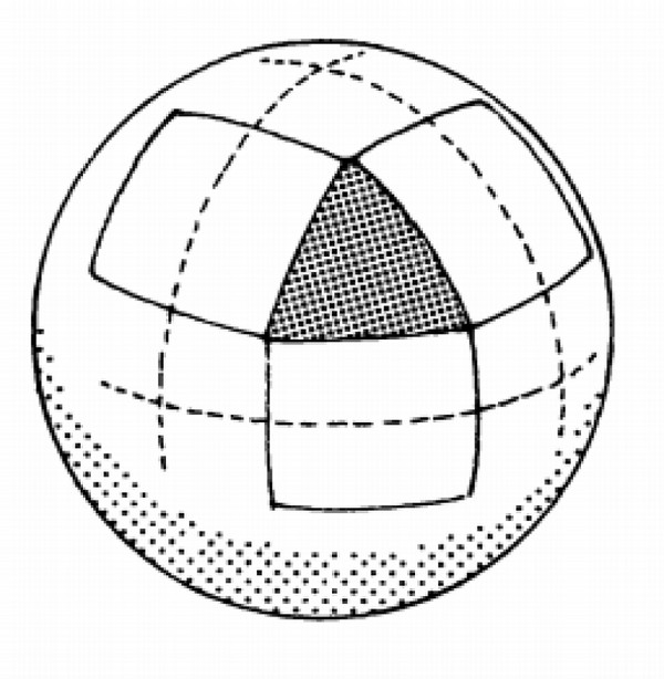 Las caras vacías, sutiles y etéreas de la Nebulosa A 1702 representan el paso de lo denso, estático y pesado del cubo a la esfericidad. No es un cubo, no es una esfera, está en un paso intermedio porque los triángulos lo han liberado de sus esquinas de 90º. Sin embargo, no ha podido liberarse de sus ejes.