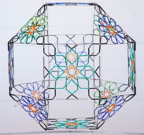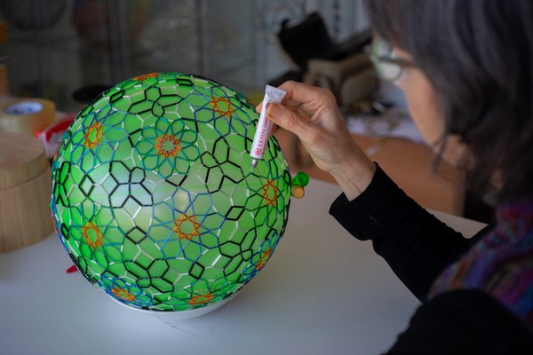 Utilicé como método una bola en la que dibujaba coordenadas. Marqué los puntos de los vértices de los 18 cuadrados y 8 triángulos de ese poliedro y obtuve las formas arqueadas de las bases del cuadrado y del triángulo. En estas formas estudié las medidas y los colores de los 2768 tubos de vidrio para que los diseños de las estrellas de ocho y nueve puntas pudieran dar forma simétrica a la esfera. Con este mismo método, cualquier poliedro puede ser esférico y este es mi nuevo proyecto.