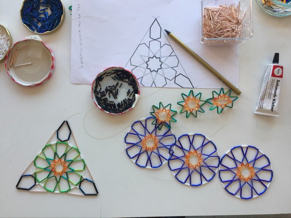 Siguiente paso: -ajustar las estrella a su polígono, la estrella de 9 puntas al triángulo, y la estrella de 8 puntas al cuadrado. Para que tuviese consistencia como forma plana, los uní a unos esqueletos de alambre de acero de 1mm.