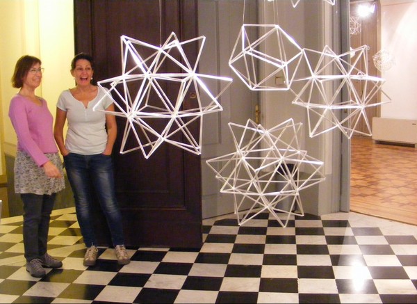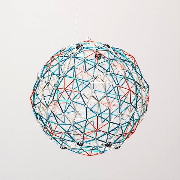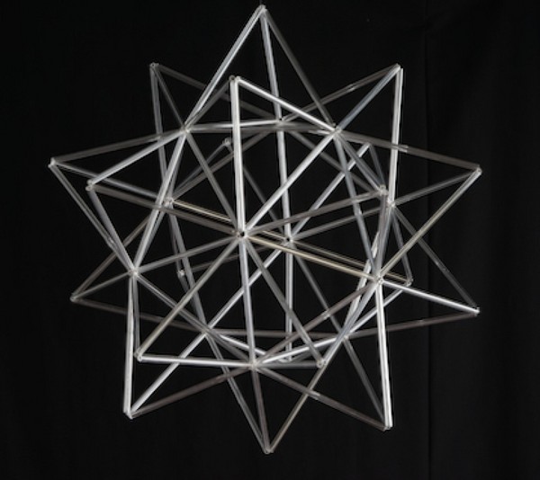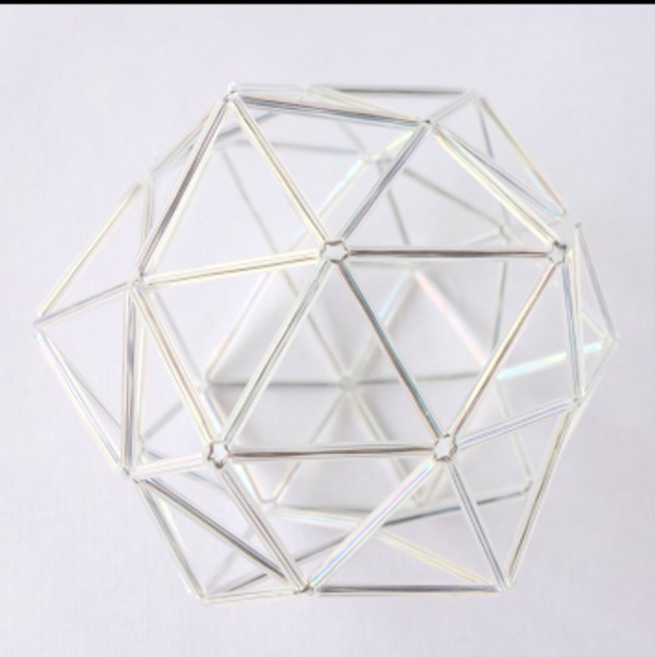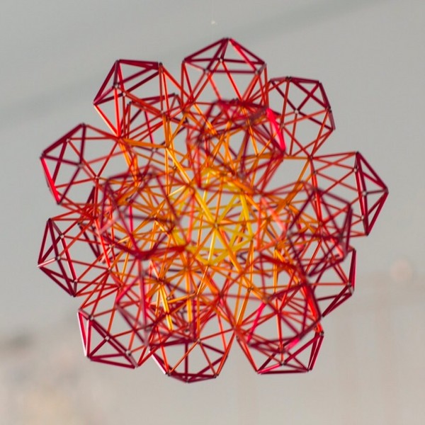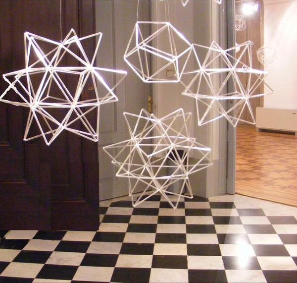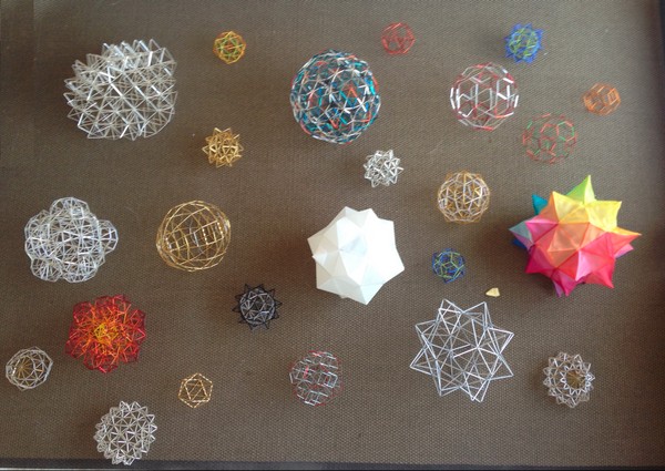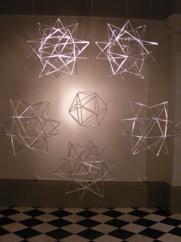 Los cinco sólidos platónicos realizados en sus variantes elevados y truncados con tubos de vidrio de diferentes colores.