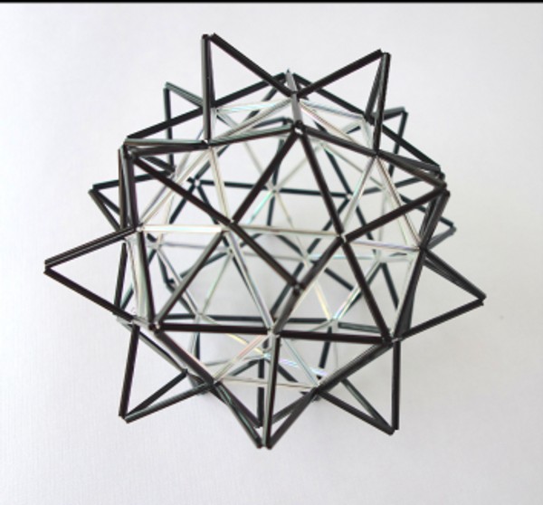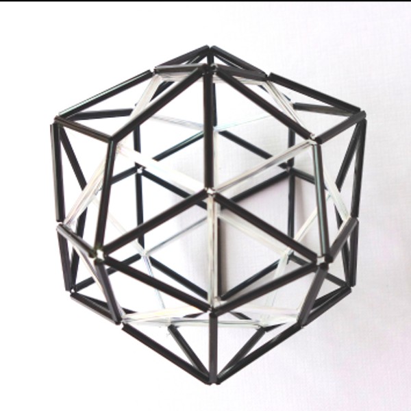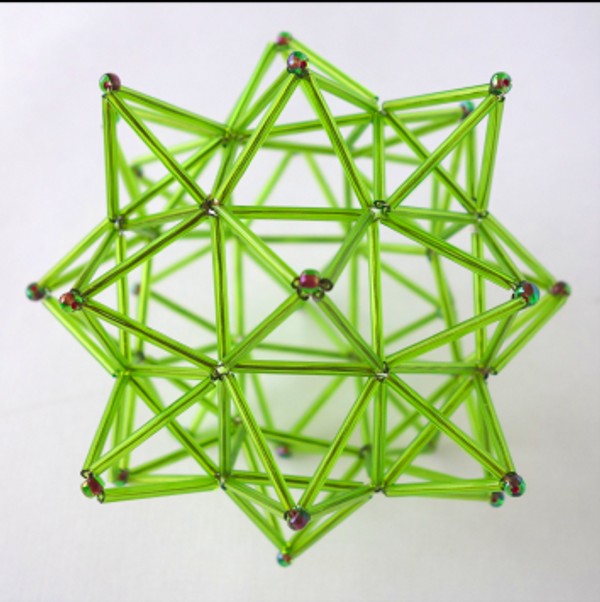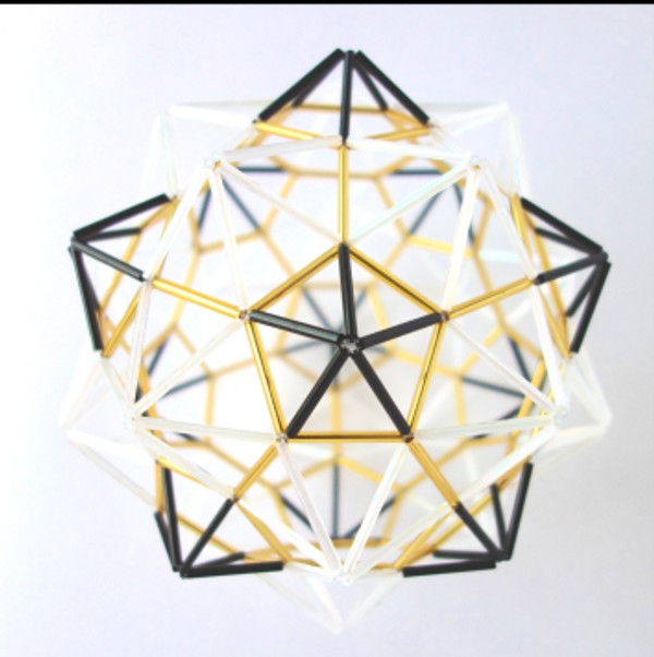 Esta cuasi esfera está compuesta de triángulos formando pentágonos, hexágonos y otros polígonos, con cierta simetría, para lograr la esferidad. Es una pieza puramente experimental. Lleva 10 piececitas construidas con pequeñas cuentas de color negro para acentuar los ejes superior e inferior.
