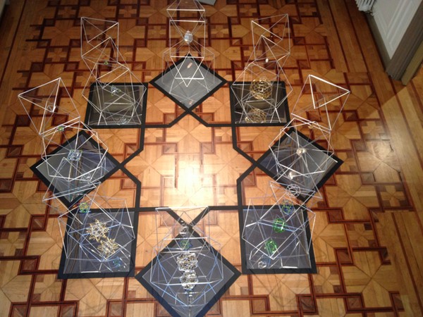 Icosaedros, cubos u octaedros de aluminio en cuyo interior están suspendidos diversos poliedros, se elevan desde una cuadrícula octogonal dibujada en el suelo y con espejos.