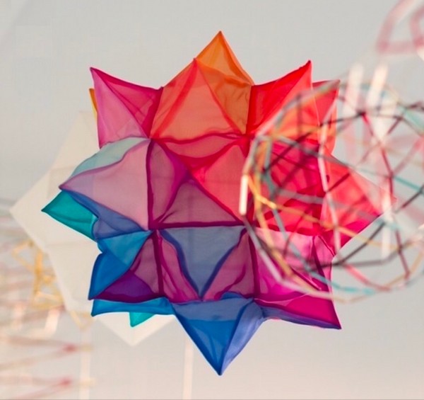 Mi experimentación con materiales, para realizar el vigintisex, en sus comienzos fué también con organza de seda y en una gama de colores para producir un rico efecto cromático. Utilicé el mismo patrón de Vigintisex de papel vegetal , pero tuve que superar varias dificultades para lograr el volumen.