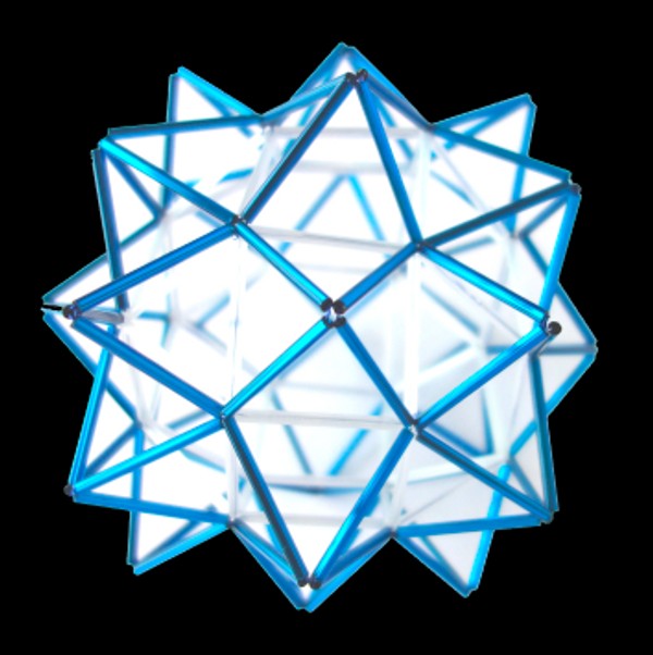Un icosaedro central y cinco icosaedros elevados al rededor de este.