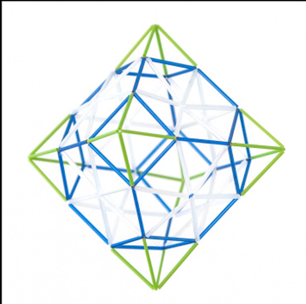 Utilizando como base un rombicuboctaedro he organizado octaedros en una sucesión de 4 niveles, los que podrían continuar infinitamente y seguiría quedando una pirámide.