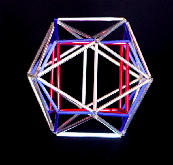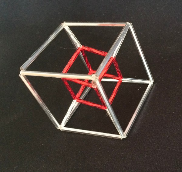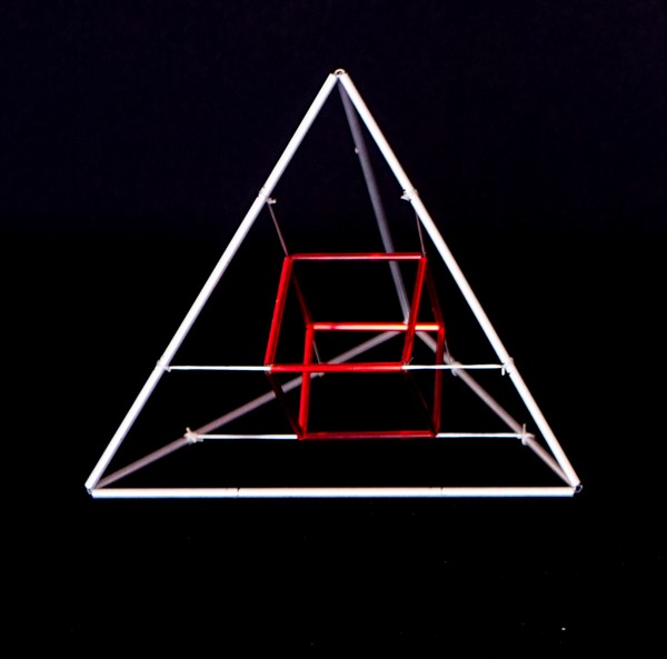 El hexaedro ó cubo dentro de un tetraedro me ha dado una grata sorpresa. No hay sólo uno como está representado en las primeras imágenes, sino que hay tres cubos entrelazados como aparecen mas abajo.