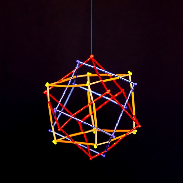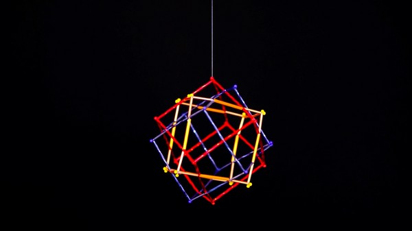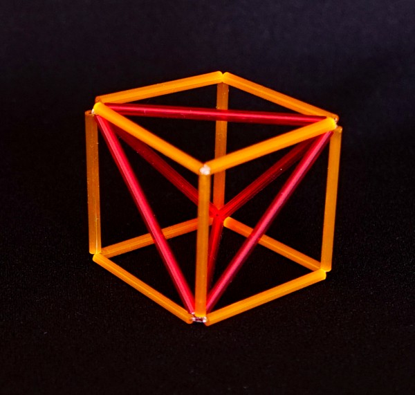 Tres cubos entrelazados que se ordenan dentro de un tetraedro.