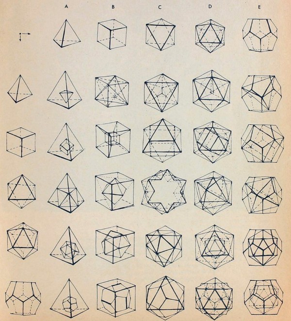 Cada uno de los cinco sólidos platónicos o poliedros regulares, anida dentro de sí otro poliedro (de hecho TODOS están anidados infinitamente hacia el micro o macrocosmos). Esta anidación tiene unas reglas: cada vértice del anidado debe tocar una cara o un vértice del poliedro que lo contiene, conservando ambos todas las características de un sólido platónico. Estoy estudiando los anidados siguiendo esta imagen del libro “Order in space” de Keith Chritchlow.
