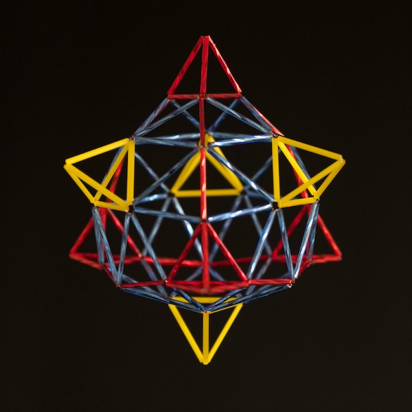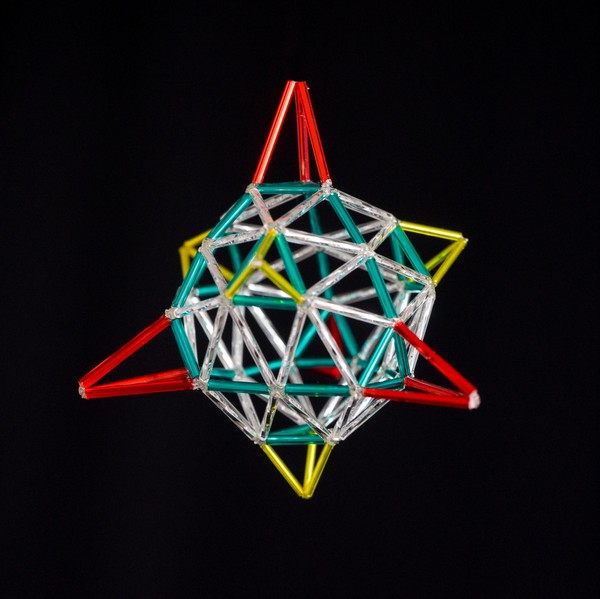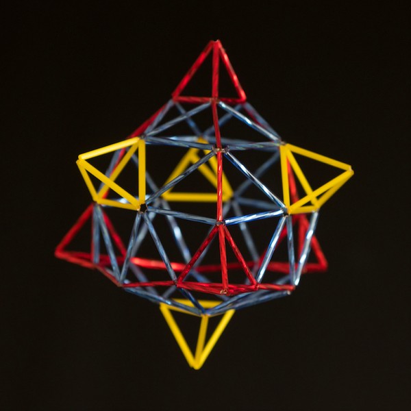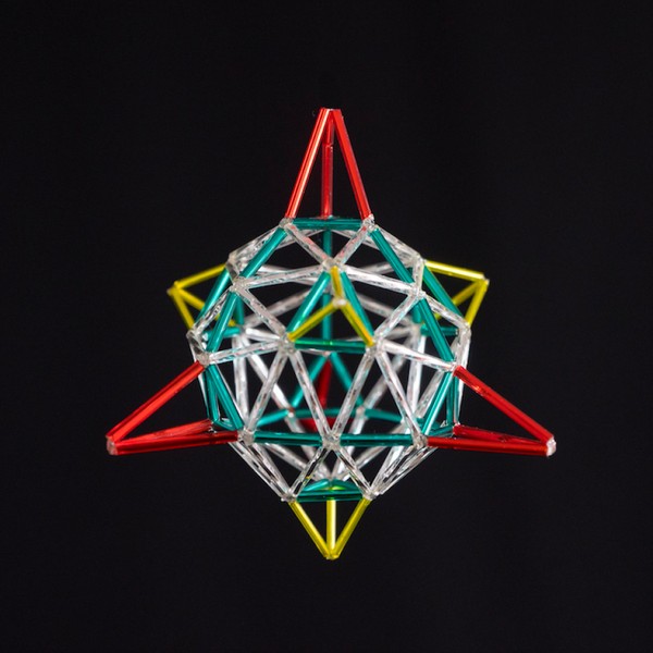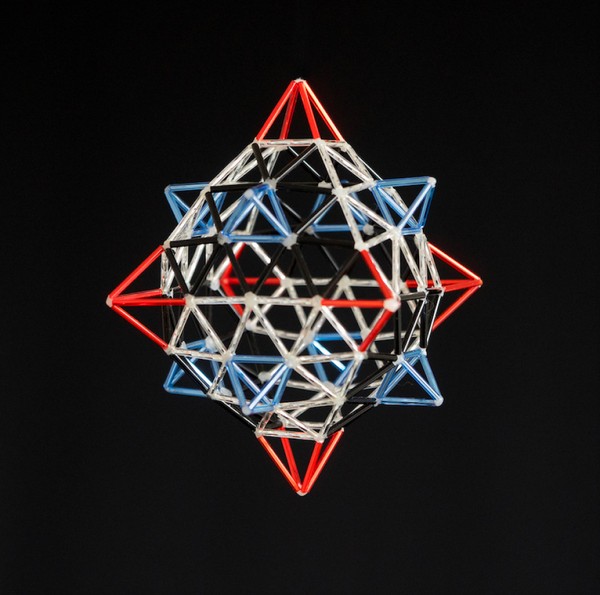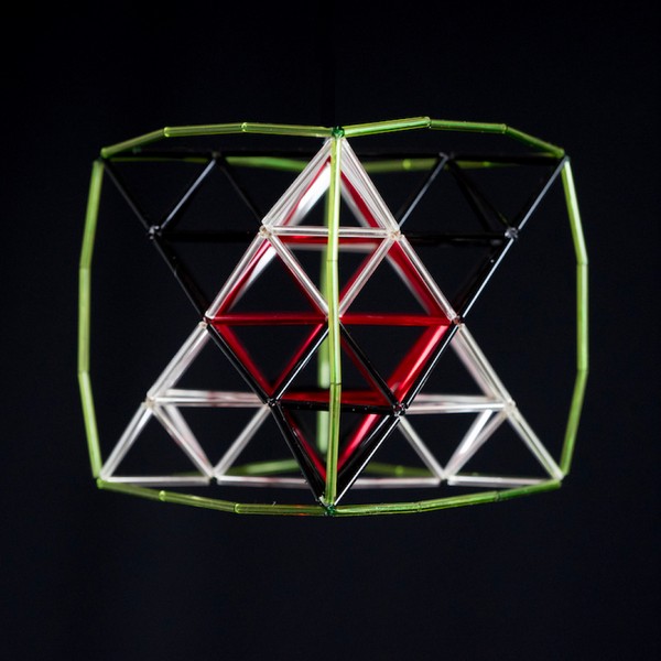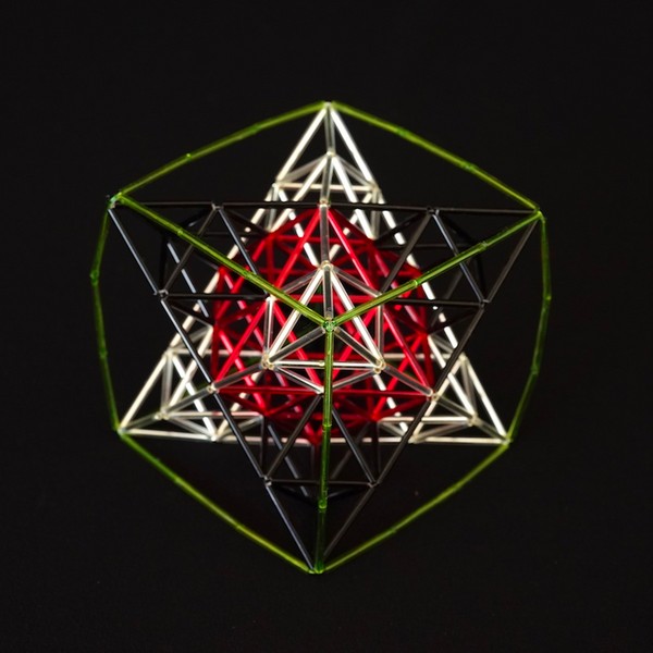 Descripción: Dos tetraedros, uno blanco y otro negro se entrelazan y en su interior nace un octaedro rojo... o... de un octaedro rojo se expanden dos tetraedros, uno blanco y otro negro entrelazados... y para protegerlos están las fuerzas del cubo de líneas verdes cuyo punto de unión es en los 8 vértices creando, así, un solo poliedro que contiene (de forma visible) 3 sólidos platónicos diferentes.