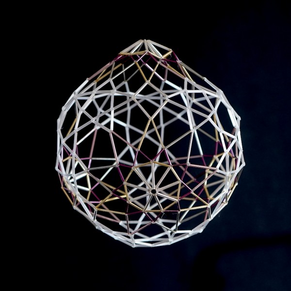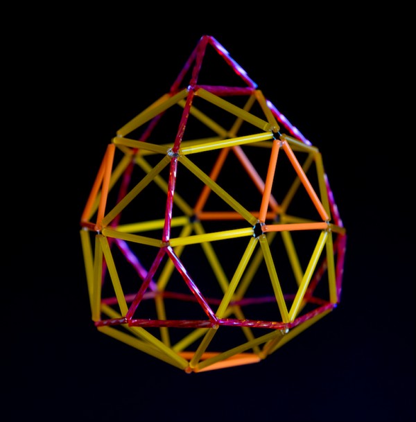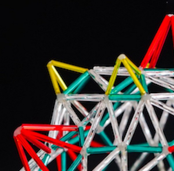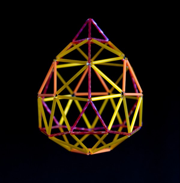 Descripción: Secuencia de un poliedro en cuatro escalas de crecimiento. El resultado de su construcción con piezas de vidrio o cristal de Murano es una esferoide imperfecta.
