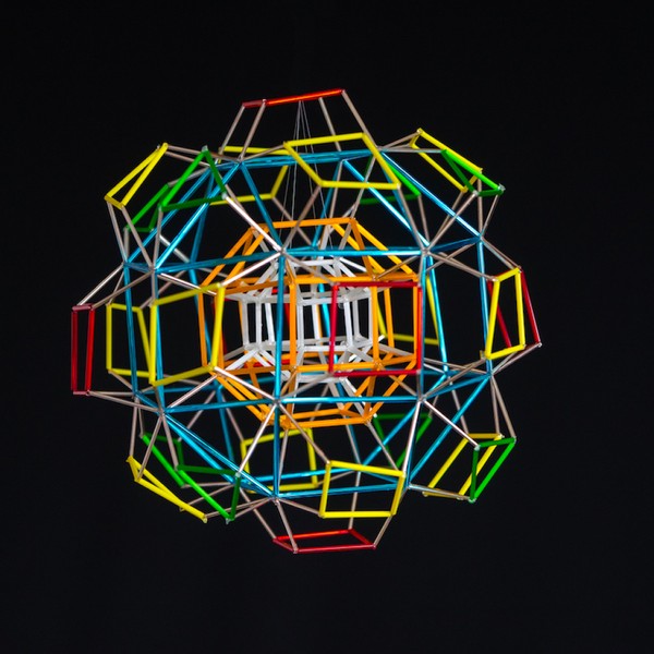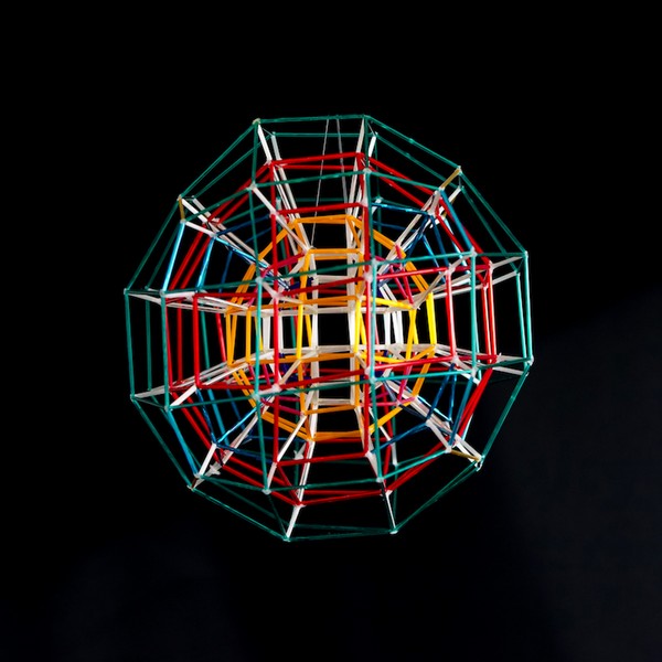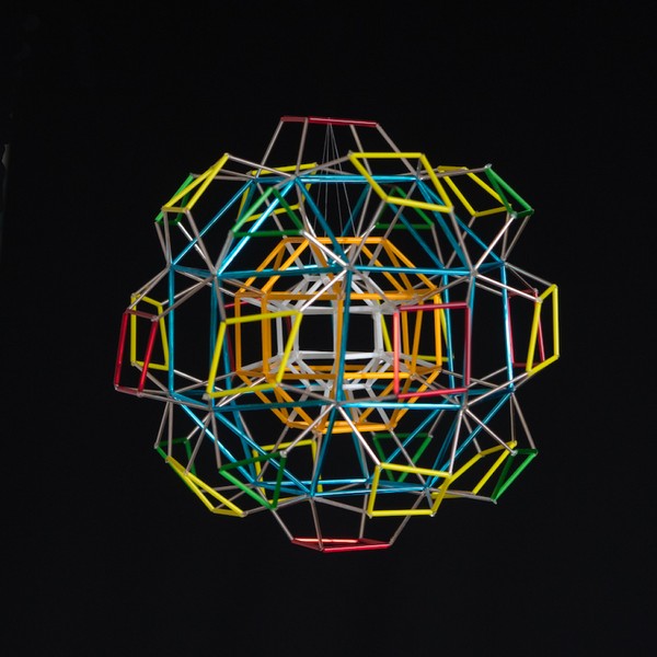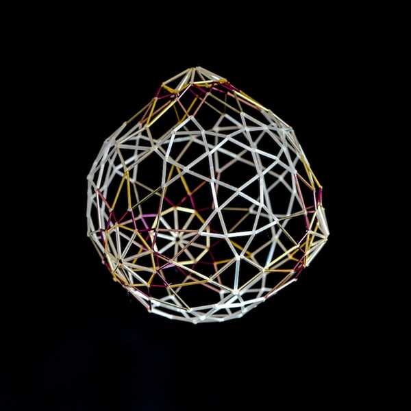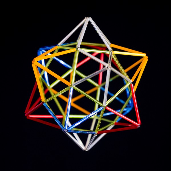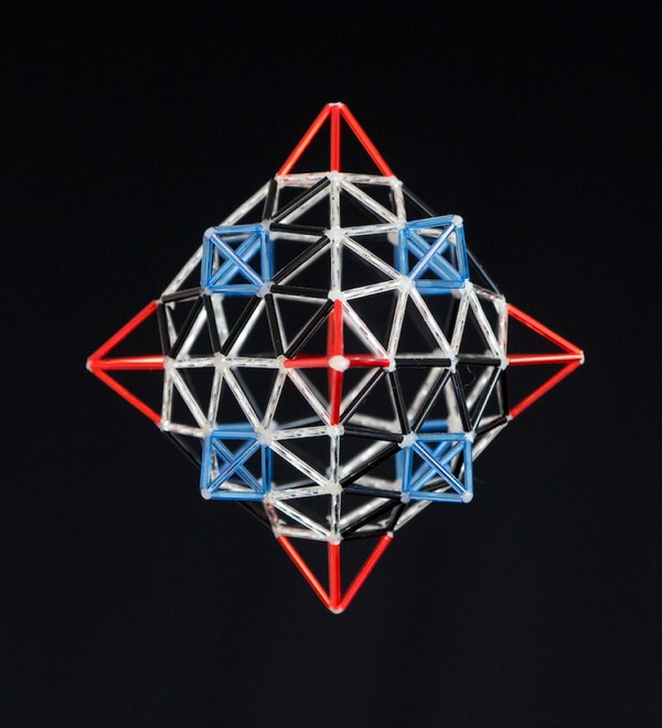 Descripción: Pequeño poliedro que se forma a partir de un módulo de orden 9 con simetría tetraédrica. Los colores aplicados permiten dar un acento en puntos estratégicos y forman parte de un lenguaje didáctico para entender mejor la forma base aplicada al construirla.